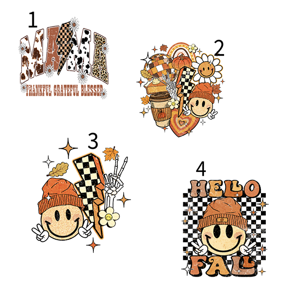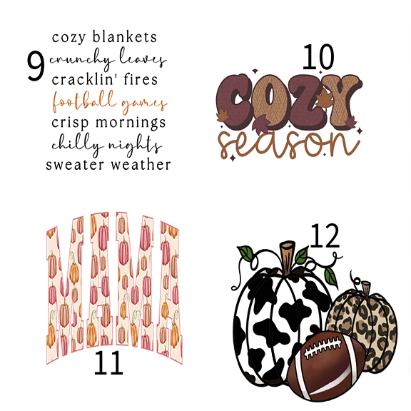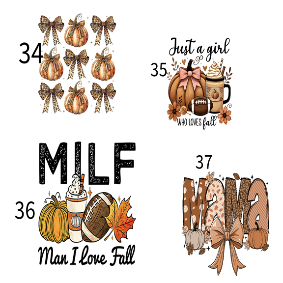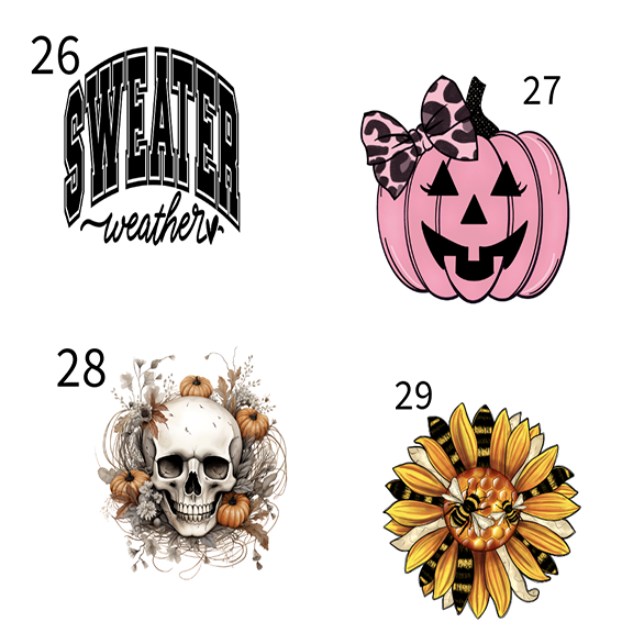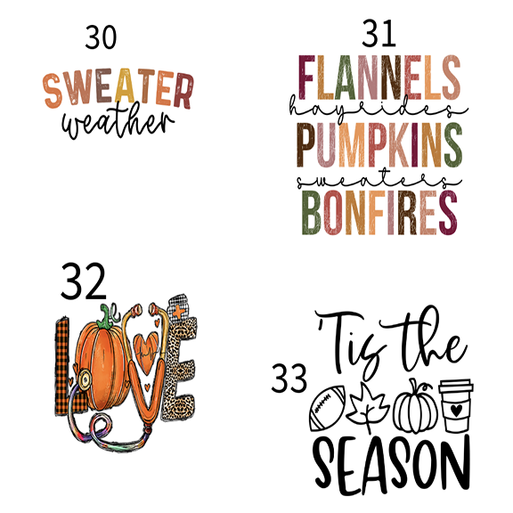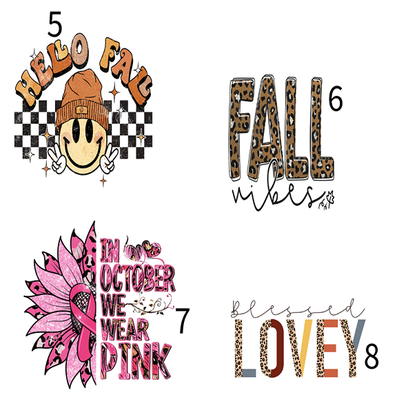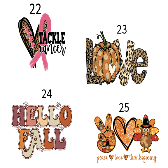 Here are the choices for the Fall prints! These prints can be put on any bleached crew or t-shirt! Once you have found the print or prints of you choice, head over to the shirt options. Once you have chosen your choice of shirt, please leave note in checkout of the print of your choice. For instance, if you choose print 9 from the Fall section, you would leave: Fall 9 in the notes. If you have multiple shirts orders, please make sure you leave note for each one so we are able to put the correct print on the correct shirt!